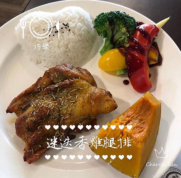 座落於田野間的簡餐咖啡店,小巧的外觀、裡面有寬敞的大空間,從櫃檯到擺設櫃、放滿了老闆的收藏品,還有一個大書櫃,可以看一下午的書。餐點以簡餐為主、也有素食喲!還有很多種類的茶品與咖啡,也少不了鬆餅跟炸物類的點心。上菜囉!迷迭香雞腿排$170 雞腿排很入味、配菜也很豐富,還有一塊香甜的南瓜!